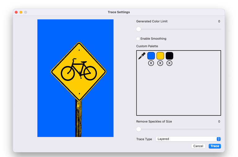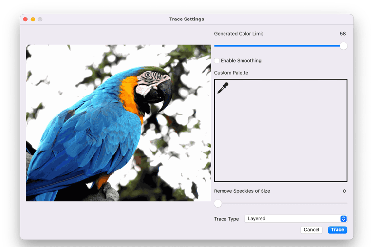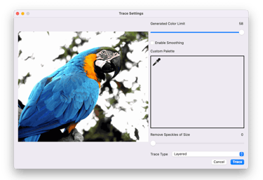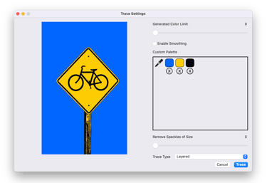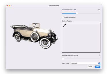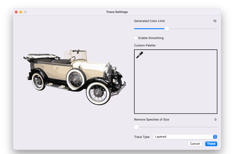 The Automatic Palette Selection Algorithm can be constrained to choose even fewer colors. In this case by dragging the slider, only 10 colors were needed to produce a photo like quality trace.