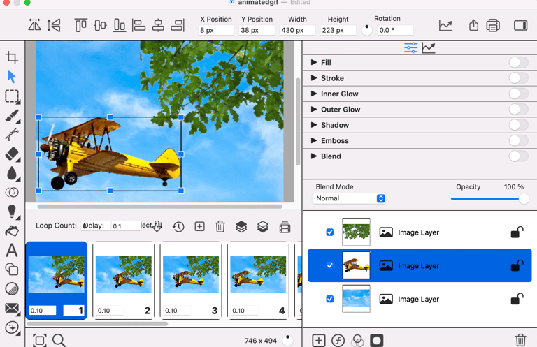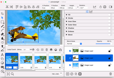 Bring your still layers to Life with frame animation. Translate, Scale, or Rotate your Image, Text or Shape Layers to create motion. You can even import other animated gif elements into your final creation.