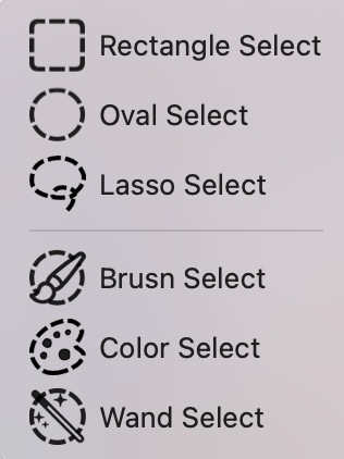 Shape your selections with precision — draw rectangles, ovals, lassos, use color-range or wand, or paint via brush — then refine with erode, dilate, and feathering.