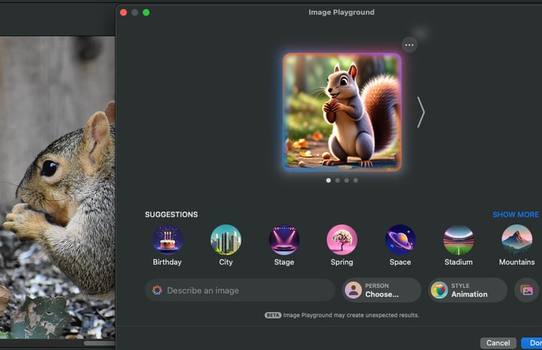 Feed your own image into Apple’s Image Playground and guide its transformation with expressive prompts and style choices — from Animation to Illustration or Sketch. Requires macOS Sequoia 15.2 or later, on Mac models with M1 or newer chips. Apple Intelligence must be turned on in the System Settings..