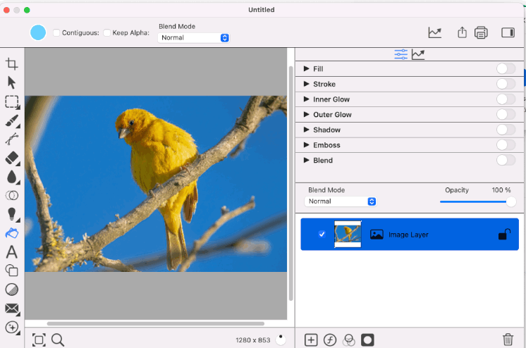 Supports fill by color and contiguous connected regions. Will preserve alpha and allow custom blend modes like Color.